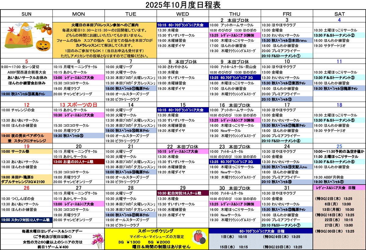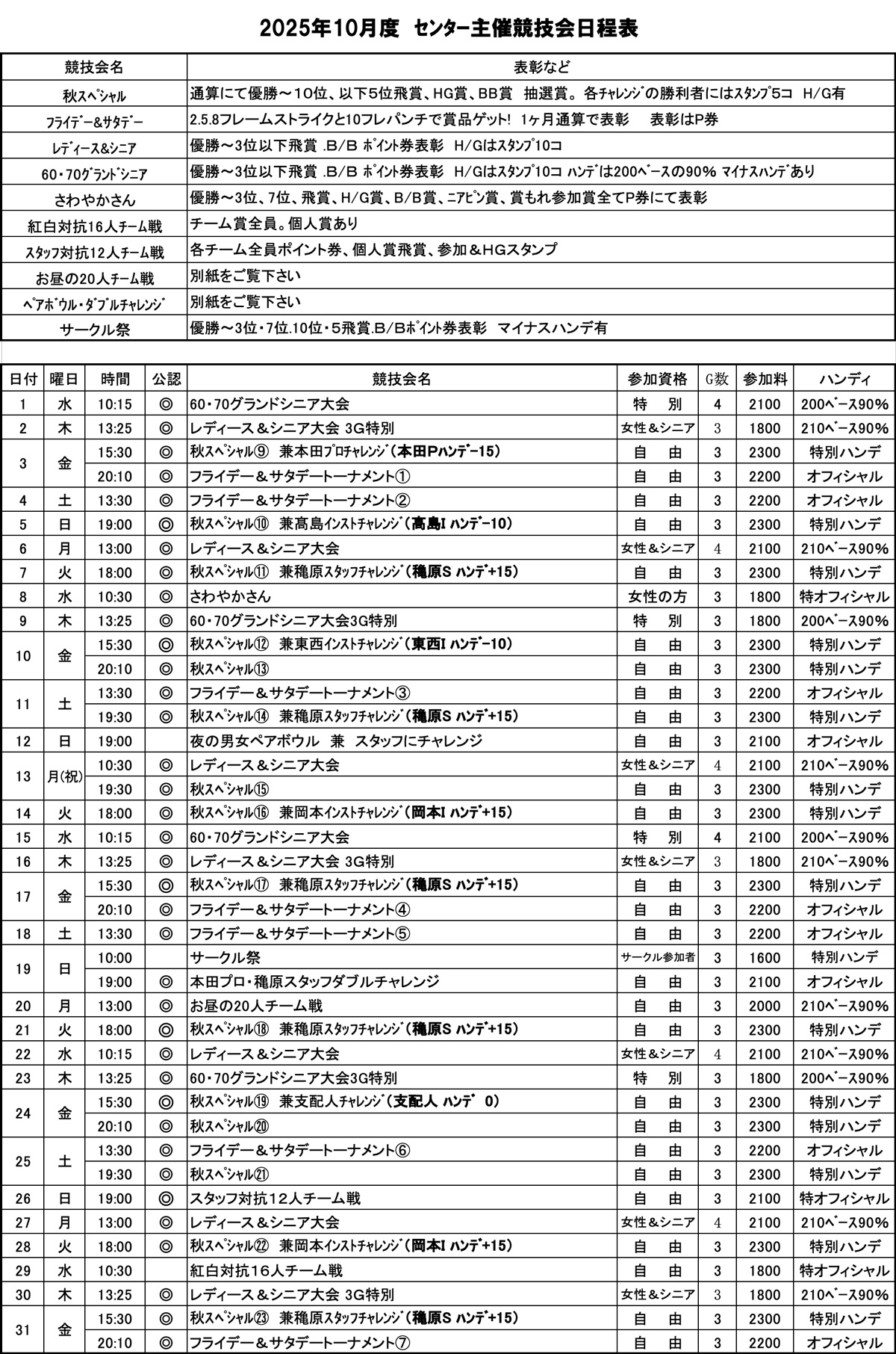 2025年10月度センター主催競技会日程表 ※Excelデータダウンロード⇒